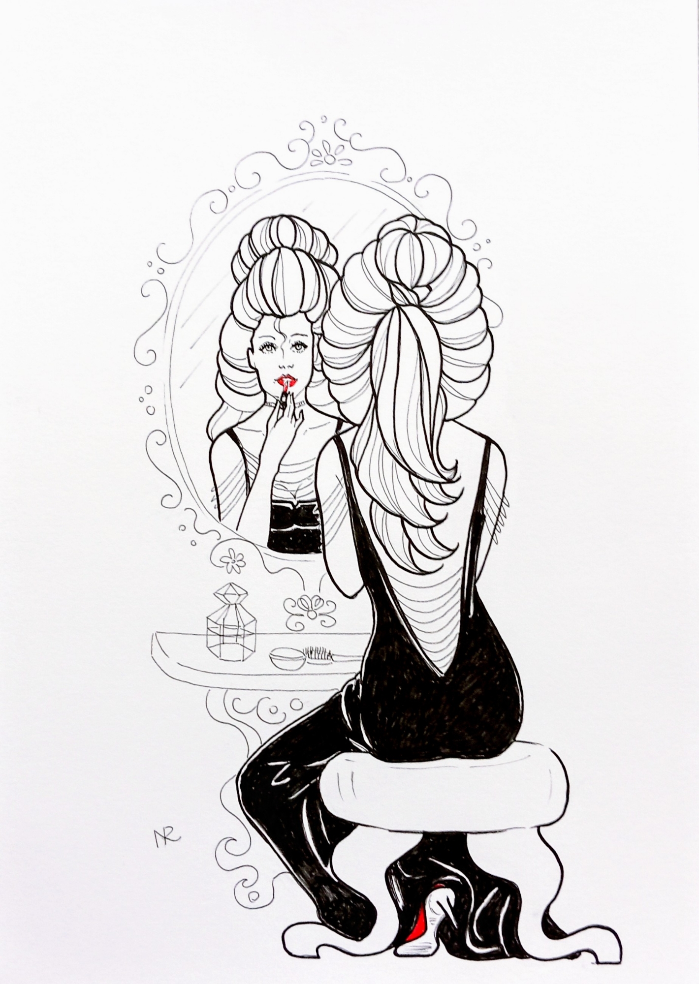 Sa che ogni linea del suo volto racconta, ogni imperfezione è una parola, ogni dettaglio una verità. Seduta davanti allo specchio, si guarda — e si chiama. Si dice: “Eccomi, sto tornando.”