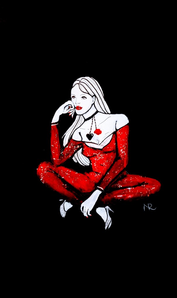L_Amanda brilla di luce propria in un equilibrio magnetico tra introspezione e presenza scenica. Il rosso acceso è come una dichiarazione: “Sono qui, e valgo.” Le paillettes che riflettono sembrano sussurrare tutte le sfaccettature di un’identità che non teme di essere vista.